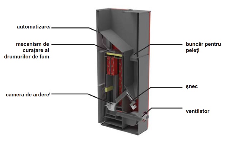 - Ardere eficienta - curatare si intretinere simplificate fata de cazanele clasice pe combustibil solid