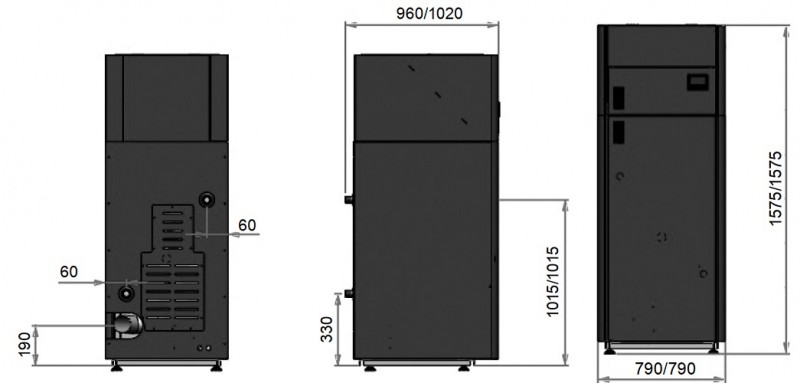 Randamentul cazanului este superior oricarui echipament conventional cu tiraj natural. Cazanul se poate monta si amplasa usor datorita dimensiunilor compacte (lungime maxima numai 1020 mm, iar buncarul de peleți este amplasat deasupra, fara a ocupa spatiu la sol)