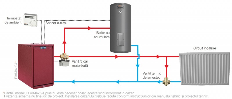 Cazan din otel pe peleti FERROLI BIOMAX PLUS 24 cu boiler incorporat 100 litri - 24 kW - schema de instalare